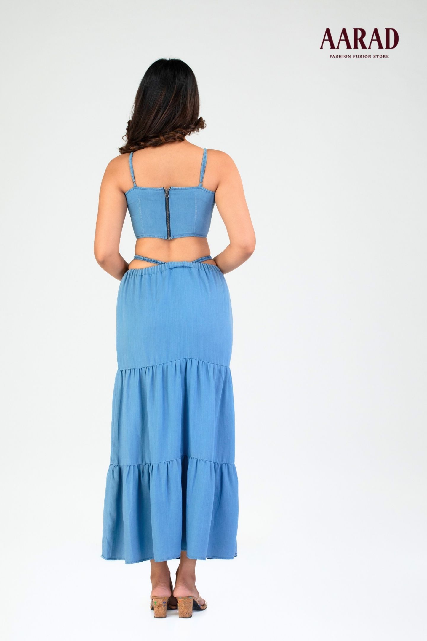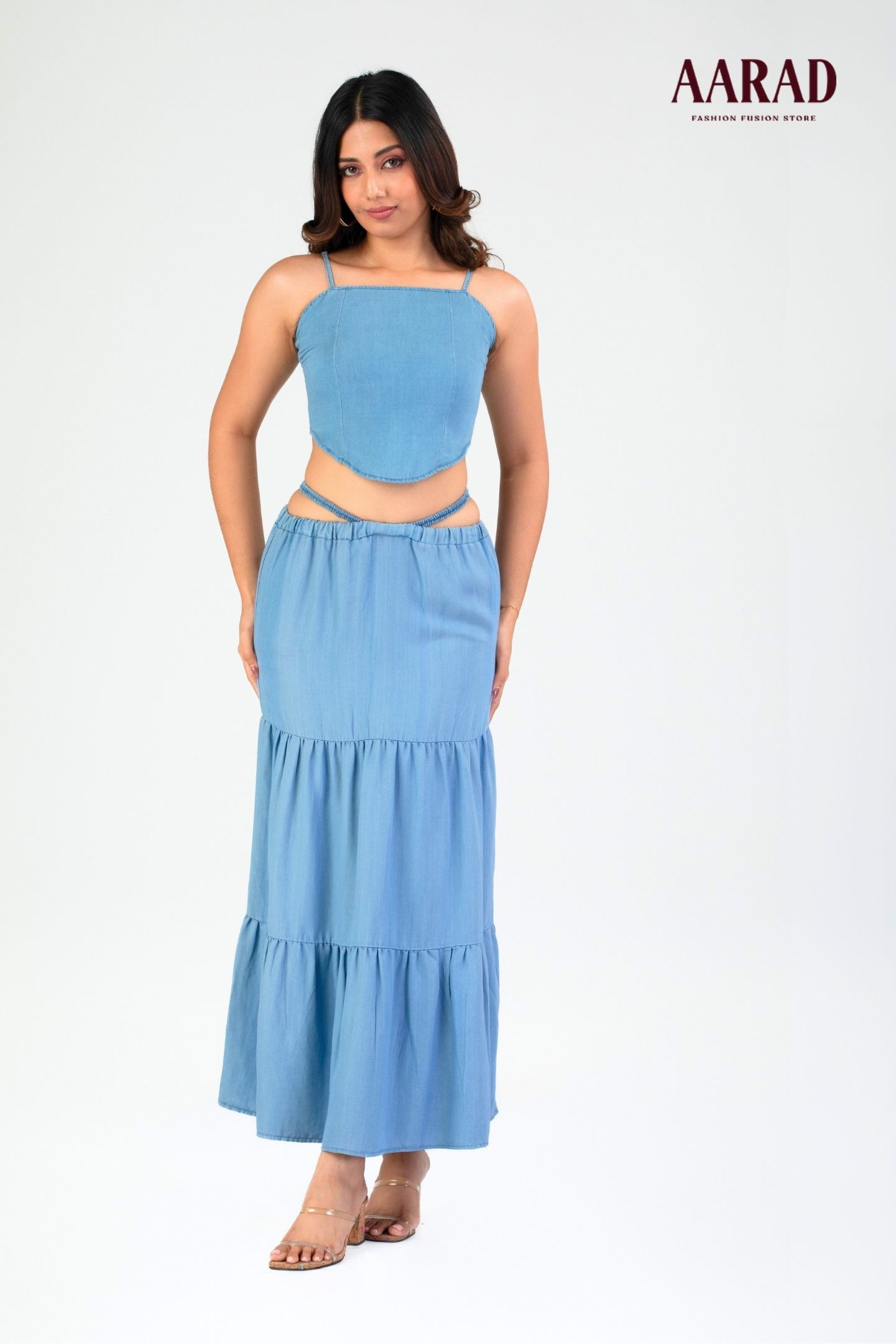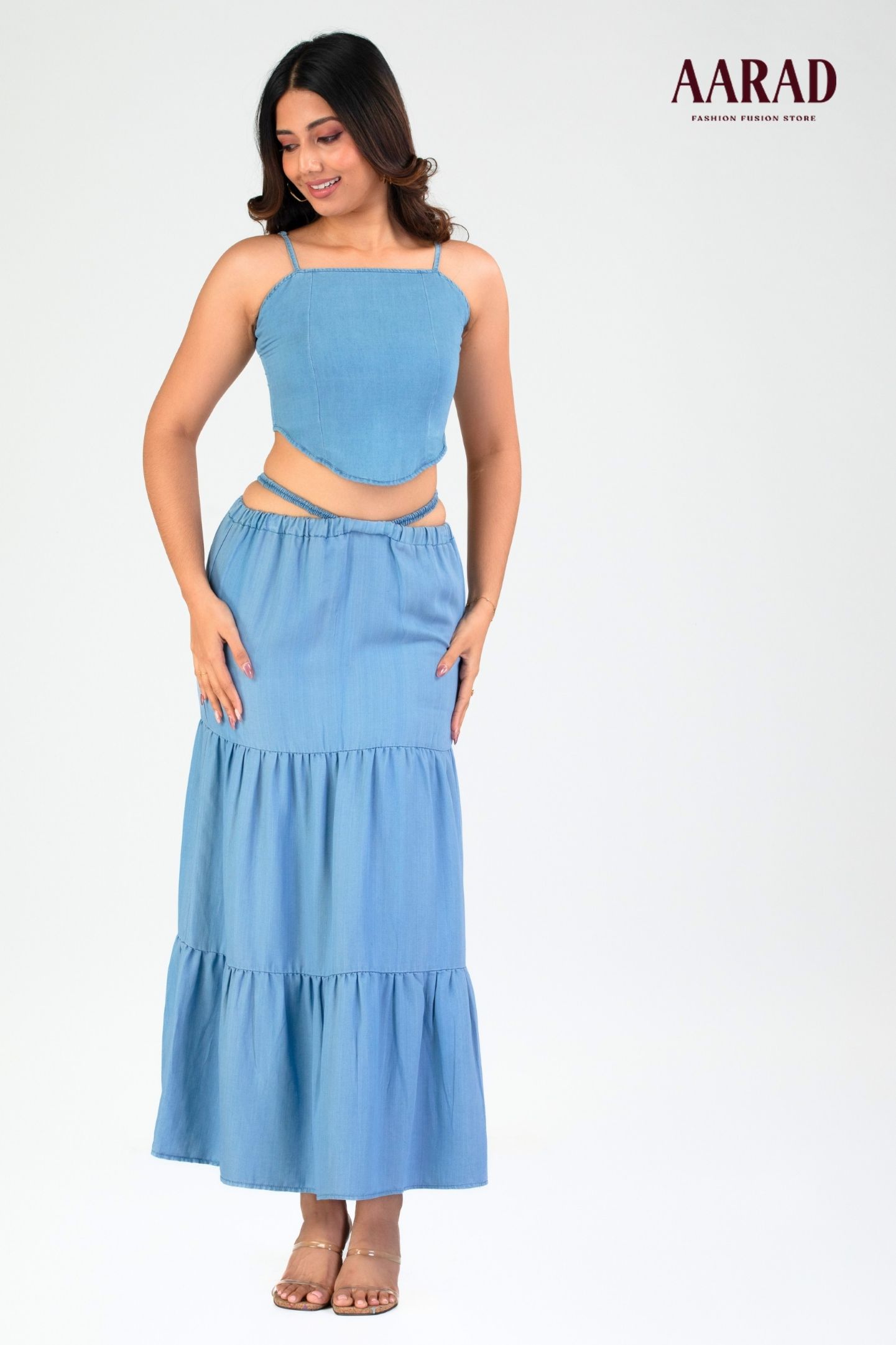 Elevate your everyday look with the Valeria Chambray Skirt, crafted from lightweight washed chambray fabric for all-day breathability and comfort. Designed with a relaxed fit and midi length, this skirt features a tiered silhouette and subtle elasticated cross-strap detailing for added texture and charm. Perfectly versatile, it transitions seamlessly from casual outings to laid-back office days. A wardrobe essential that blends effortless style with everyday functionality..